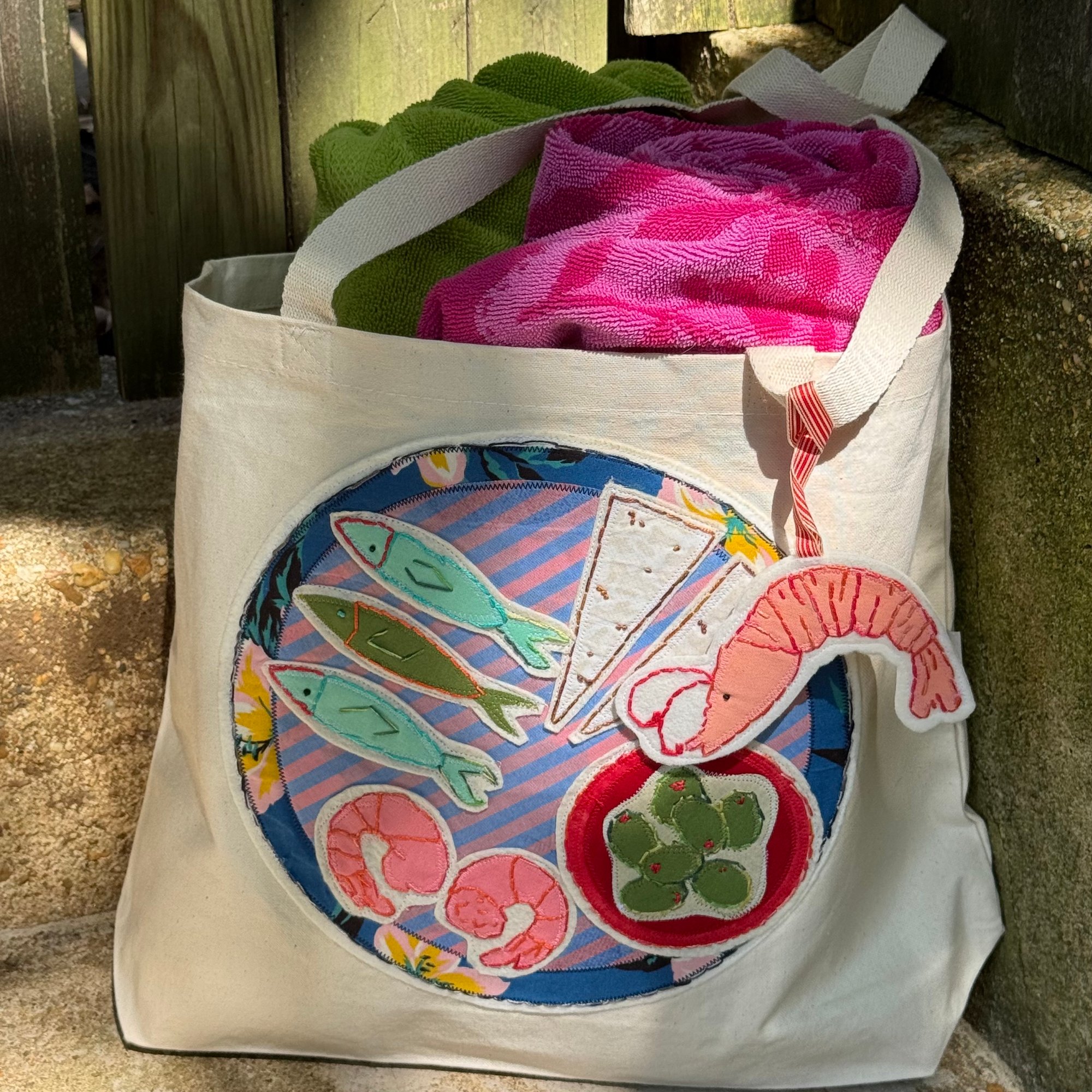 Hand-appliquéd and hand-embroidered art on both the front and back of the tote bag