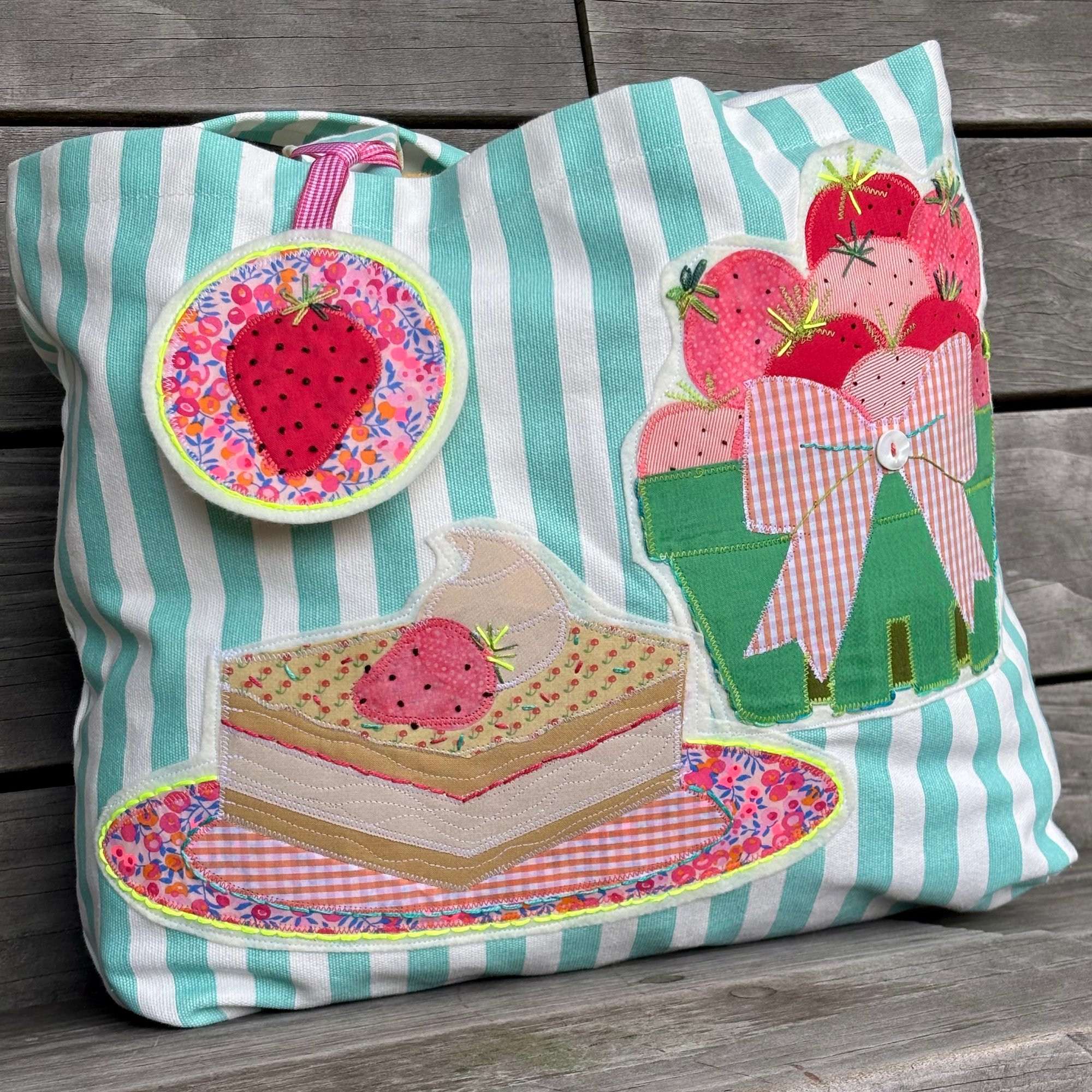 Hand appliquéd and hand embroidered artwork on tote bag